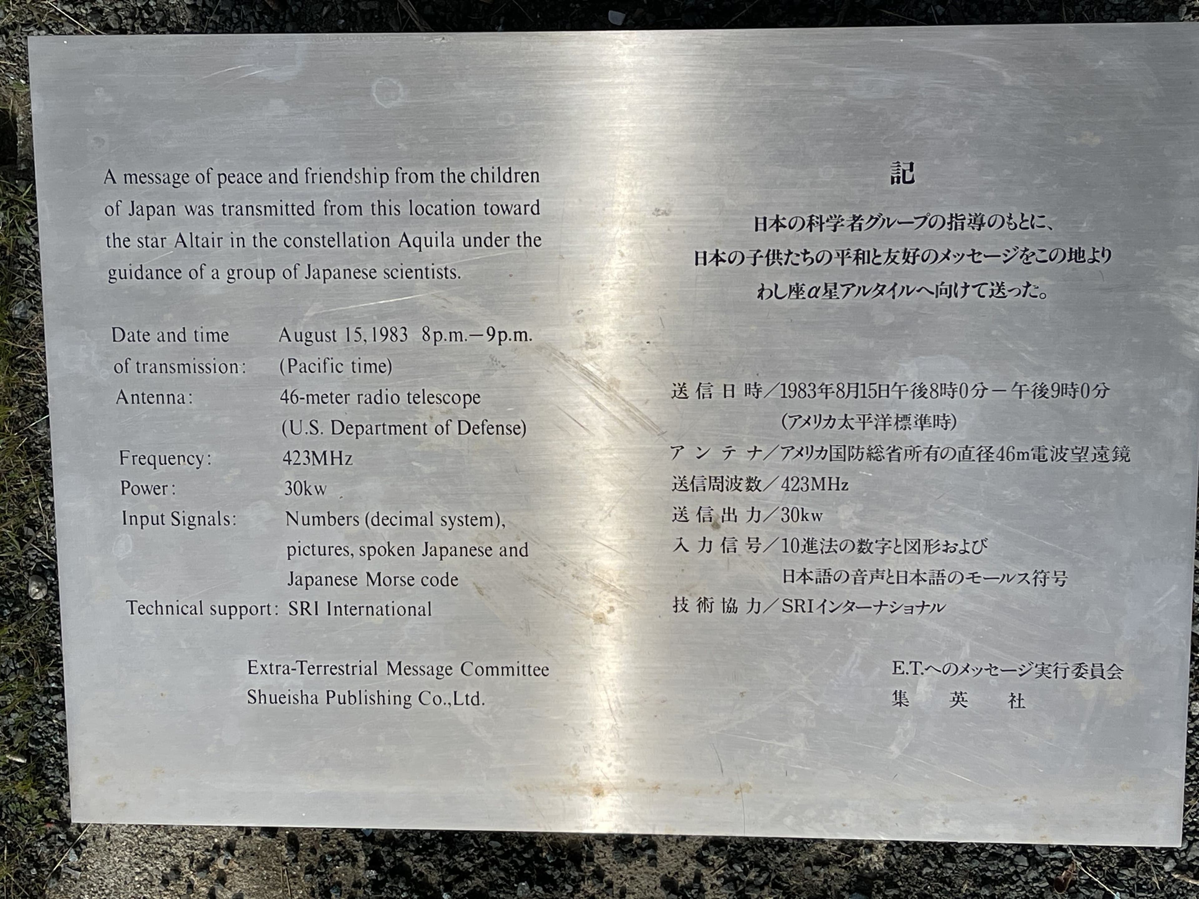 A message of peace and friendship from the children of Japan was transmitted from this location towards the star Altair in the constellation Aquila under the guidance of a group of Japanese scientists.