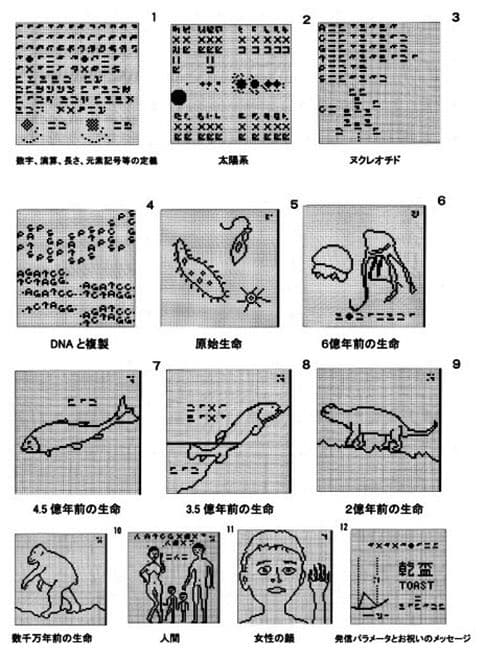 They create 13 images. 71×71 pixels each. bitmap diagrams showing our solar system, DNA, a human figure, basic mathematics. On the final image, above the chemical formula for ethanol, they write one word: "TOAST" (乾盃).