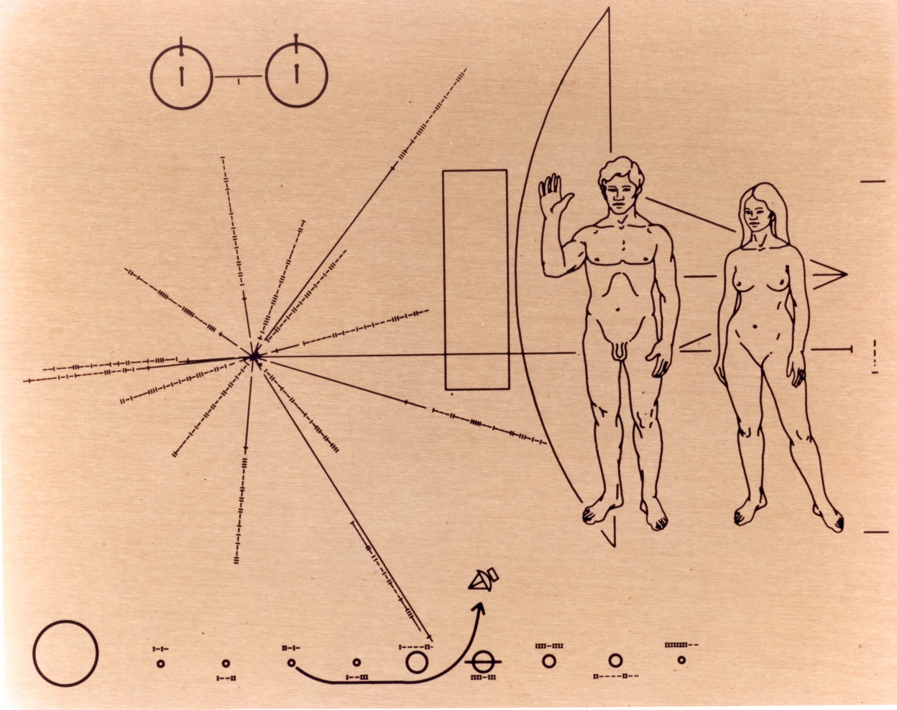 Gold-plated diagrams bolted to spacecraft, showing our location, our bodies, our solar system.